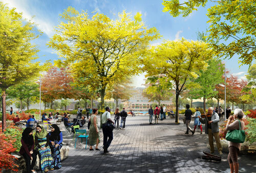 Voor de bebouwing en het park wordt 8 hectare land aangewonnen in de Rijnhaven. Drijvende parken die aan de noordelijke (Wilhelminapier) en zuidelijke (Katendrecht) kademuren zijn gekoppeld, vormen een aanvulling op een nieuw park van 6,5 hectare dat op het gedempte land aan de oostkant komt (zijde Posthumalaan). Alles wordt met elkaar verbonden door wandelpaden die op verschillende manieren een rondgang om en deels over het water mogelijk maken. Bewoners en bezoekers worden verwelkomd langs twee nieuwe pleinen naast de metrostations: het Luxorplein in het noordoosten en Metro Plaza in het zuidoosten.