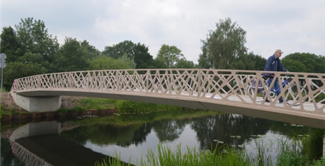 Voor de test van het ultrasterke beton op de oever vlakbij de brug werkt ontwerper en hoofdaannemer FDN samen met ENCI en Mebin, de grootste cement- en betonproducenten van Nederland. De proefplaat die wordt getest is gemaakt door De Jong's Betonbedrijf uit Maarssen. Het betonmengsel van de proefplaat is een ontwikkeling van ENCI en is gemengd door Mebin. Die plaat is 45 millimeter dik, bijna tien keer dunner dan de brug. Terwijl de brug voertuigen tot 12 ton moet kunnen dragen, zal de plaat ernaast worden belast met 35 ton.
