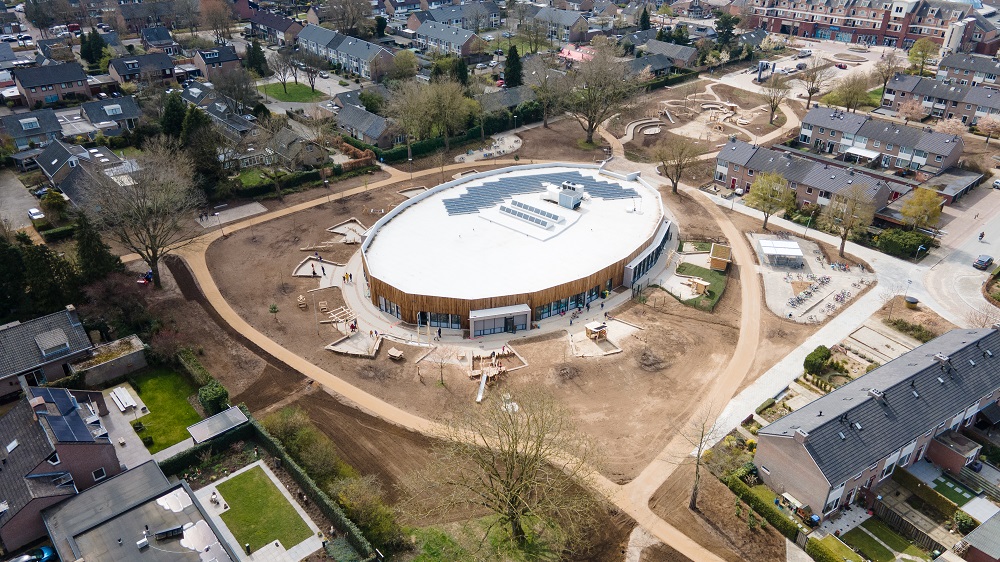 Glazen gevels en terrassen markeren de openheid die zo typerend is voor het kindcentrum. Dat geldt ook voor de buitenruimte, ontworpen door Buro Poelmans Reesink en bureau Niche en uitgevoerd door groenaannemer Dolmans Landscaping. “Er zijn geen hekken. Het openbare park gaat ongemerkt over in het schoolplein. Het park, met een oppervlak van 200 bij 200 meter,  biedt voor alle kinderen een fijne speelplek en voor omwonenden een groene oase om te wandelen en te recreëren.”