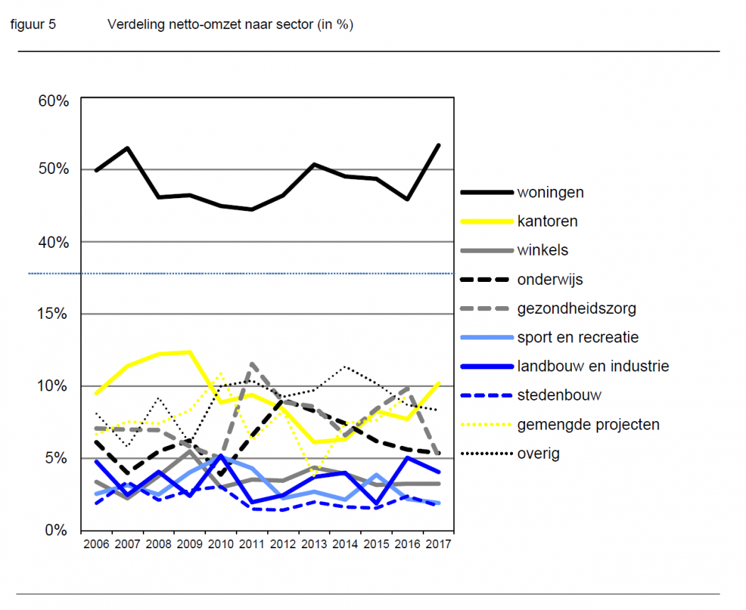 Vooral de omzet uit woningen en kantoren is gestegen. Particulieren blijven de belangrijkste opdrachtgevers. Het bedrijfsleven komt op een tweede plaats. Ook het omzetaandeel van corporaties, projectontwikkelaars en particulieren nam toe. De omzet vanuit de overheid en de gezondheidszorg liet een daling zien.