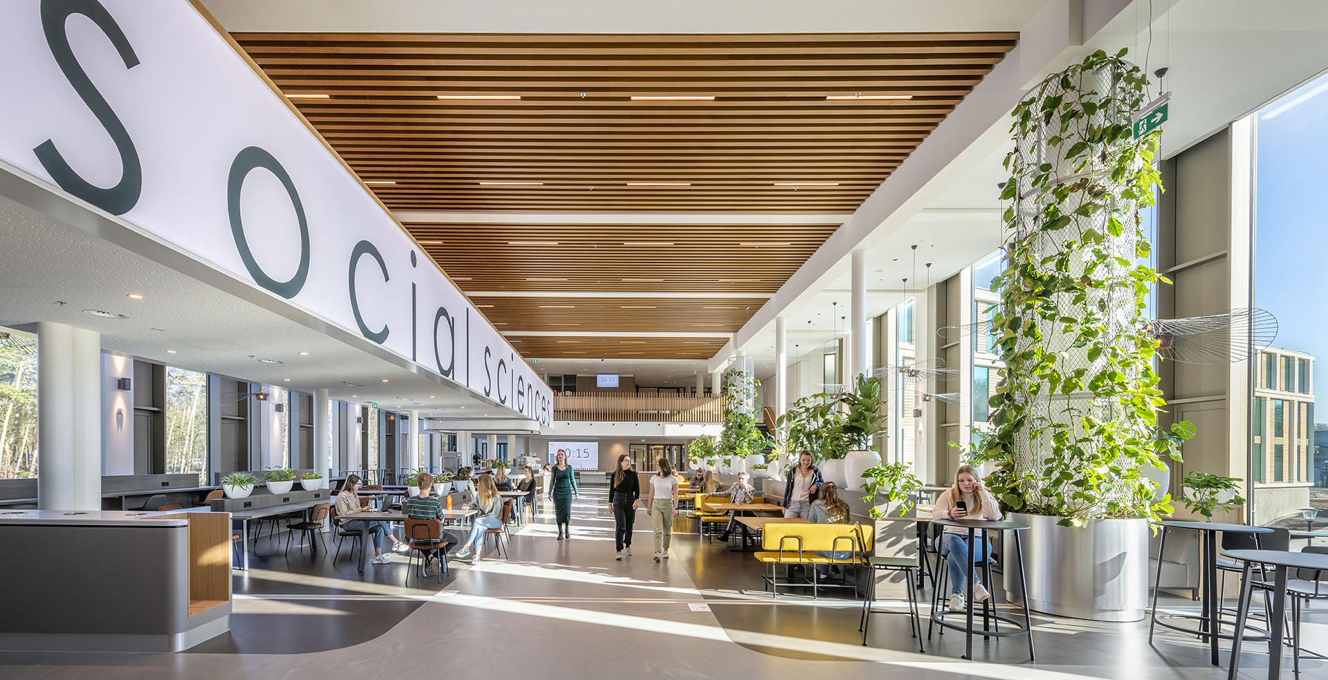 De brede trappen aan de atria vormen de ruggengraat van het gebouw en nodigen uit om te bewegen. Zij rijgen de belangrijkste (onderwijs)ruimten aan elkaar. Dat vergroot de interactie tussen studenten, medewerkers en onderzoekers. Bovendien kunnen studenten in één oogopslag zien wie er is of waar er nog plek is om te werken.