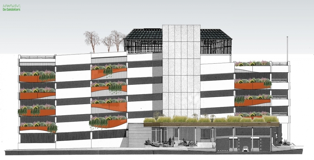De Haarlemse parkeergarage De Kamp wordt voorzien van een deels groene gevel. Het ontwerp hiervoor is gemaakt door architectenbureau De Dakdokters uit Amsterdam. De gevel krijgt drie verticale stroken waarlangs het groen omhoog kan groeien.