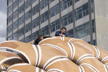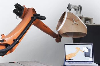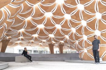 En ook in de individuele elementen zelf is naaidraad ingezet, verwerkt door een KUKA-robotarm en een industriële naaimachine. Professor Dr. Jan Knippers van het ITKE: “Textiele verbindingsmethoden in houtbouw maken extreem lichte en goed functionerende houten schaalconstructies mogelijk.”