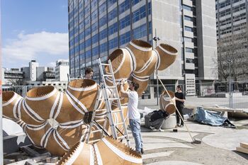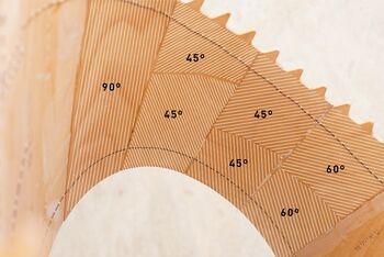 De individuele elementen werden door een KUKA-robotarm en een stationaire industriële naaimachine stuk voor stuk samengesteld uit drie vlinderdasvormige beuken platen. Knippers: “Om de anisotropie van het hout te benutten, werden deze stroken op maat gelamineerd, zodat de looprichting en de dikte overeenkomt met de stijfheid en de buiging die verlangd werd voor de verschillende radiussen van de 151 elementen. De gebogen vorm van de delen wordt vastgehouden door ze industrieel te naaien.”