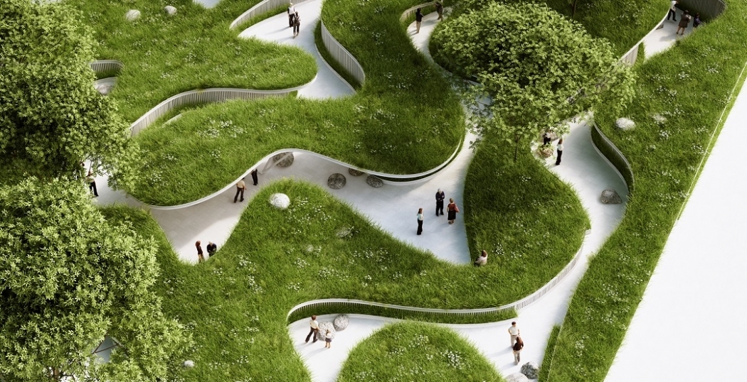 Penda ontwerpt landschap paviljoen met rivieren als wegen