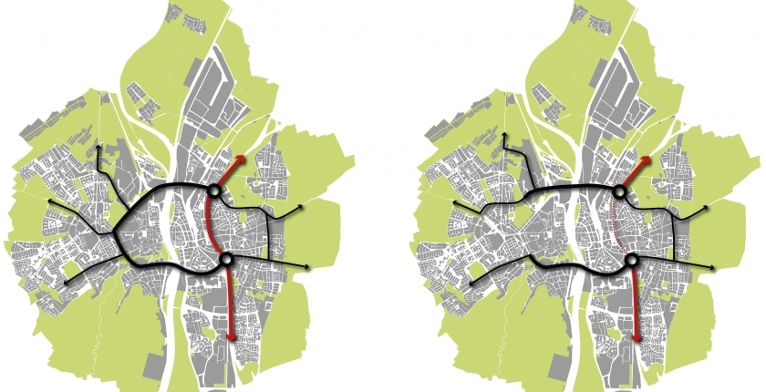 Placemaking in Maastricht. De ringstructuur wordt vervangen door twee tangenten van oost naar west voor de doorstroming van het autoverkeer. Het unieke is dat er tussen deze twee tangenten een ‘luw’ gebied ontstaat.