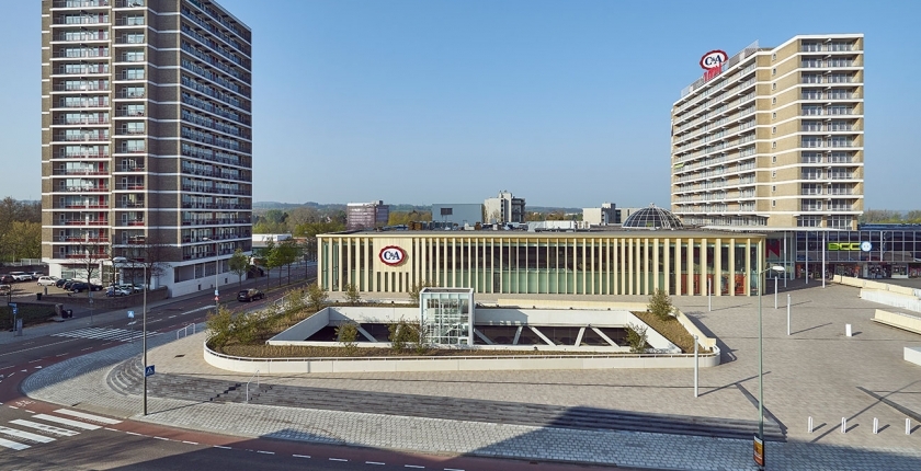 De speciaal voor dit project ontworpen verlichting reflecteert tussen de onbehandelde houten palen op de goudkleurige raamkozijnen en tonen in de avond een warme gloed. De ingang, waarbij het nieuwe ontwerp aansluit op het bestaande gebouw uit de jaren '60, bestaat uit een hoge ruimte, die zich onderscheidt door zijn slanke aluminium en vrij hangende luifel. De nieuwe winkelruimte, momenteel in gebruik door C&A, is ontworpen met oog op de toekomst. Een grote hoeveelheid daglicht creëert de mogelijkheid voor een interne uitbreiding.