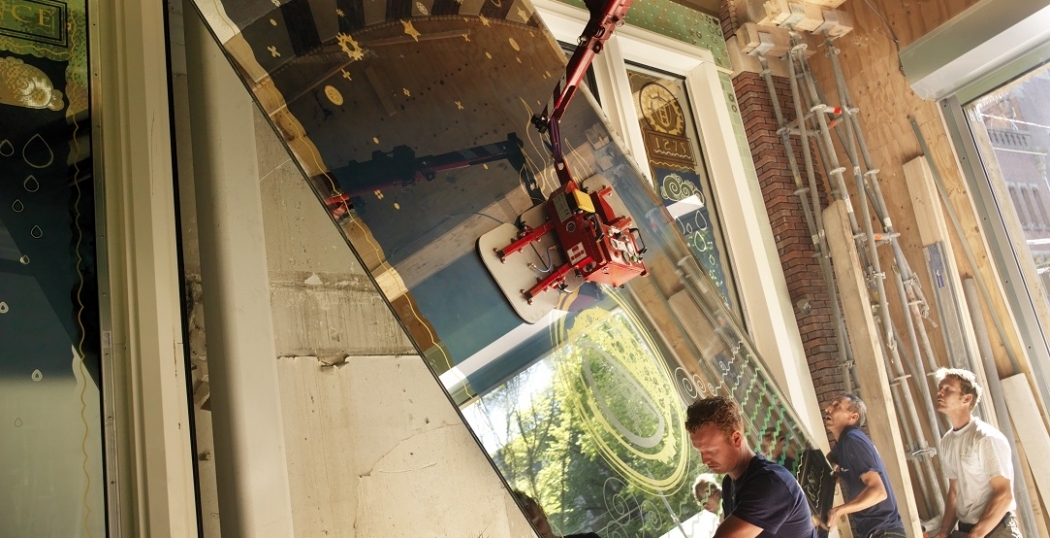 De glasplaten werden door een speciale robot ingehangen in de Beurspassage.