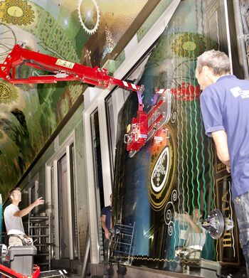 Een speciale glasrobot tilde de spiegels, met een formaat van 3 bij 4 meter en een gewicht van 500 kilogram, van de trailer. Vervolgens werden de spiegels een kwartslag gedraaid en zo de Beurspassage ingereden. Daar zijn ze op de wanden van het kunstwerk bevestigd.