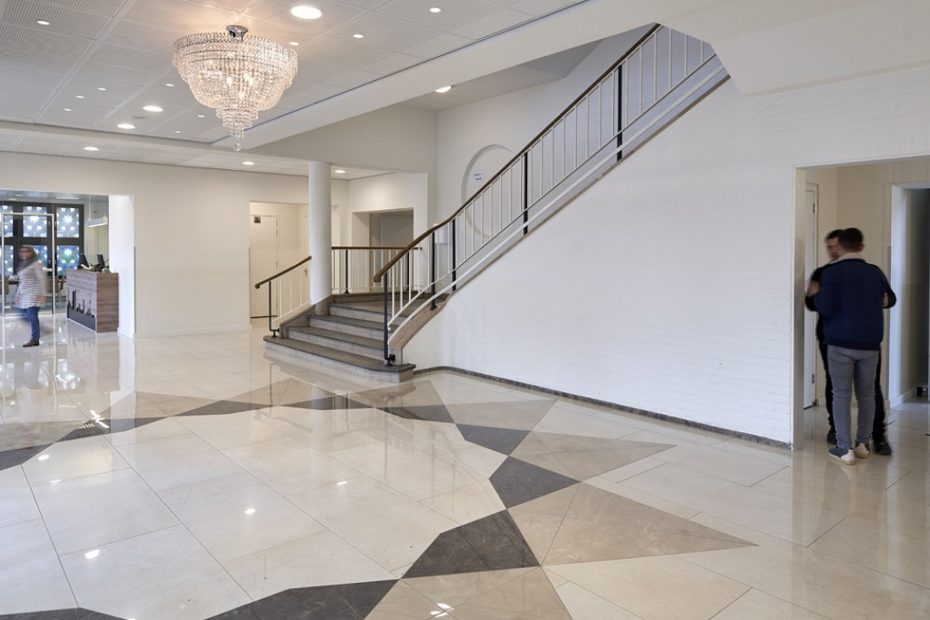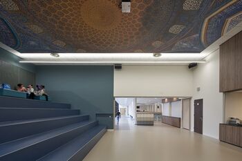 De rondgang op de begane grond heeft een duidelijke routing, ondersteund door 8-puntige sterren ter hoogte van de belangrijke plekken. Op de vloer van de aula staat een afbeelding van de Rotterdamse Maas. Foto’s van diverse Arabische landen decoreren het plafond. In het hele ontwerp zijn arabeske elementen gecombineerd met de bestaande architectuur zoals het schoonmetselwerk en originele plastieken. De debatruimte, met een levensechte foto van het plafond van de Sheikh Lotfollah moskee, kan gerust spectaculair genoemd worden. Dat geldt overigens ook voor de entree, waarin de originele trap behouden is.