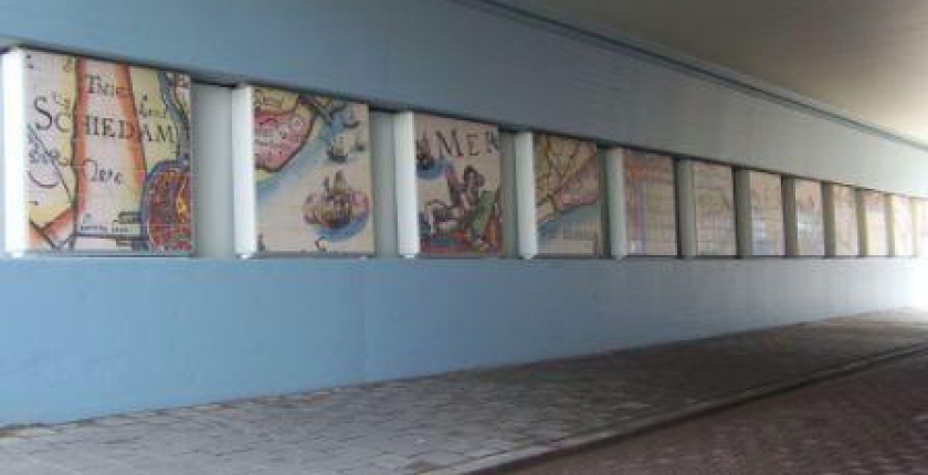 Het spoorviaduct aan de 's Gravelandseweg in Schiedam heeft een bijzondere make-over ondergaan. De onderdoorgang is in opdracht van de gemeente en op initiatief en naar het ontwerp van kunstenaar Brigitte Bot voorzien van tegels die fragmenten van een historische kaart van Schiedam uit 1610 verbeelden. Van het totale tegelwerk van 345 m² (8.000 stuks) is ruim 110 m² (3.000 tegels) voorzien van een unieke, ingebrande afbeelding. Vrijdag 24 mei heeft burgemeester C. Lamers van Schiedam deze kleurrijke historische 'stadspoort' onthuld.