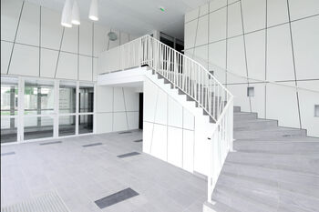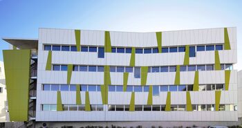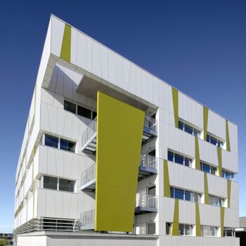 Met ROCKPANEL plaatmateriaal worden de gevels gehuld in een smetteloos witte bekleding die benadrukt wordt door dooreengevlochten, verticale groene banden. Die banden lijken opgehangen te zijn tussen de verdiepingen. Ze verbinden de panoramische vensteropeningen die zich eveneens rond het gebouw kronkelen. Zij roepen in miniatuurvorm de enorme zonneschermen op die als bescherming dienen voor de metalen buitentrappen, in de hoeken verscholen als een anker op de voorsteven van een schip. Het Fahrenheit-gebouw lijkt ontworpen te zijn als een enorme puzzel met een Z-vormige geometrie die de regelmaat van zijn kubusvorm doorbreekt.