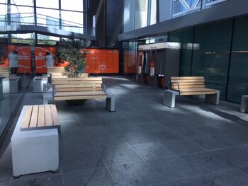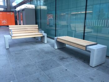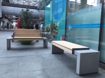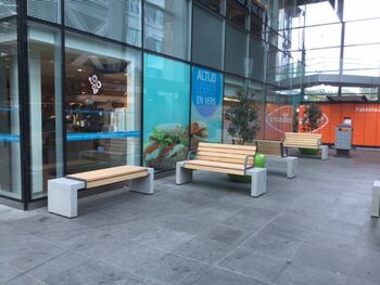 De collectie van het Oostenrijkse Miramondo kenmerkt zich door strakke lijnen en eenvoudige vormen. HopHop is het toonbeeld van dit principe. De bank bestaat uit een stalen frame en houten latten. In combinatie met de U-vormige, betonnen parkbanken oogt de bank stijlvol. Er is in dit geval gekozen voor vier banken met en vier banken zonder rugleuning.