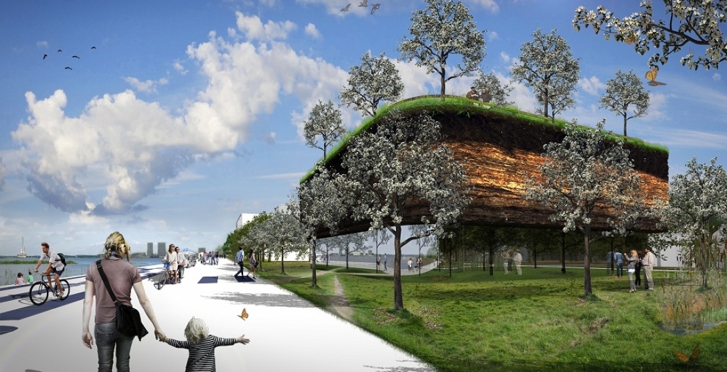 “Een vijf meter dikke laag Flevolandse bodem wordt opgetild tot de NAP-lijn. De daaronder ontstane ruimte wordt afgesloten met een spiegelgevel. De belangrijkste hoogteniveaus van Flevoland zijn zichtbaar in het paviljoen. De boomgaard bovenop het gebouw symboliseert de vruchtbare Flevolandse grond.”