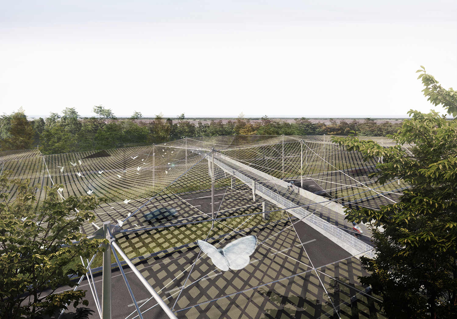 Met dit sterrenteam werd een uniek voorstel gedaan: een energieopwekkend ‘web’ over een snelweg die door een natuurgebied loopt. Het web is ingevuld met doorzichtige pv-panelen. Tegelijkertijd vormt het een ultralicht ecoduct waarover insecten veilig kunnen oversteken en niet in de luchtstromen van de auto’s en vrachtwagens worden meegezogen en gedood. Bovendien, zo is het idee, daalt de door auto’s uitgestoten stikstof en fijnstof onder het web eerder naar de randen van de snelweg. Zo wordt de bodem met name langs de snelweg verrijkt en niet het heidegebied daarachter. Juist in de zone direct naast de snelweg, waar zich een natuurlijke geluidswal van bomen en struiken kan vormen, is stikstofdepositie een relatief overkomelijk probleem.