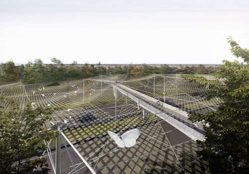 Biodiversiteit is slechts één van de vele opgaven die The Butterfly Effect wil aanpakken. “Er wordt door onder andere Rijkswaterstaat vaak naar harde oplossingen gezocht voor klimaat, energie en veiligheid”, aldus Hermen Jansen, architect bij VenhoevenCS. “Als je al die ruimtelijke en technische eisen naast elkaar legt, werk je zomaar met een profiel van 200 meter breed.” De snelweg zelf, zo argumenteert Jansen, beslaat op maaiveld een ruimte waar niets meer aan te doen is. Dus trekt het team de oplossing naar de ruimte erboven, in plaats van bijvoorbeeld pv-panelen in open velden te plaatsen. “In de meest basale versie is ons ontwerp gewoonweg een slimme oplossing voor dubbel ruimtegebruik.”