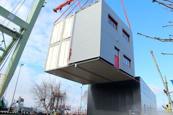 Het kantoorpand wordt met de telescoopkraan op de dieplader geplaatst.