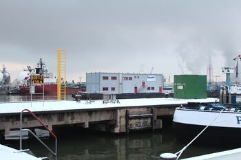 Op de dag van transport werden de twee complete modules met een zware telescoopkraan op twee diepladers geladen. Daarna werden ze over het bedrijfsterrein naar een dichtbij gelegen kade getransporteerd, waar ze met dezelfde telescoopkraan op een ponton werden geladen.