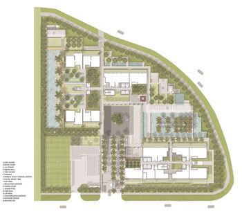 Op de begane grond, met eronder een parkeergarage, wordt meer dan 70 procent van het oppervlak gebruikt voor een reeks tuinen, zwembaden, een tennisbaan en wandelpaden.