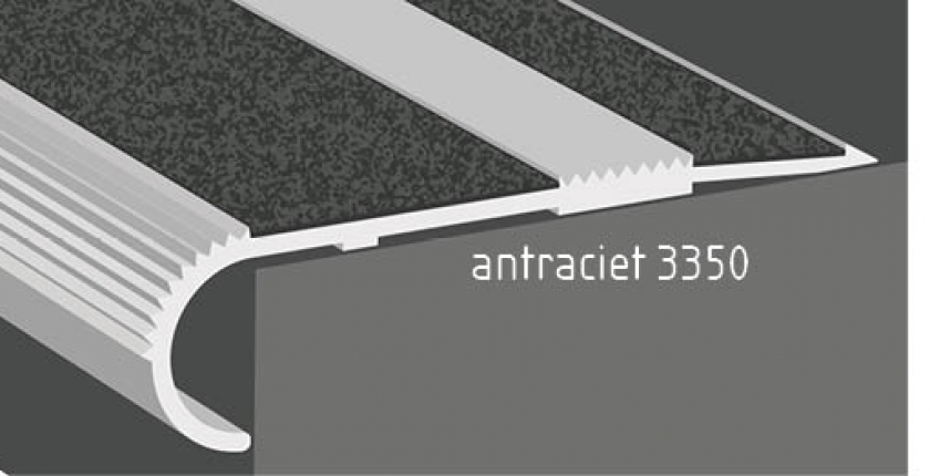 • Uitvoering B van de traptrede- en dorpelprofielen kent een Aluminium Oxide NON-Slip Toplaag. Deze toplaag is zeer geschikt voor het ‘zwaardere werk’, zowel binnen als buiten. Denk hierbij aan toepassingen op trappen in kantoren en ziekenhuizen. De toplaag is ruw en slijtvast en kent een structuur die doet denken aan schuurpapier. Dit is aluminium oxide (Al²O³, korrelgrootte grit 50), een materiaal dat zo hard is dat niet zelf op maat is te zagen.