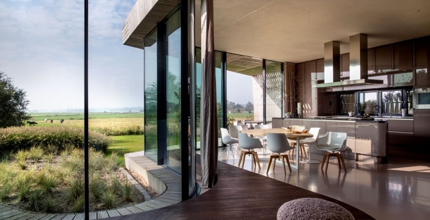 Het W.I.N.D House in de provincie Noord-Holland omvat een combinatie van duurzame oplossingen en domotica. Het huis ligt dicht bij het strand, aan de rand van een dorp en wordt begrensd door een beschutte, bosrijke omgeving aan de achterzijde en een uitgestrekt polderlandschap aan de voorzijde. Het ontwerp van het huis maximaliseert de effecten van deze natuurlijke omgeving en speelt in op de wisselende seizoenen. De meer intieme slaap- en werkkamers bevinden zich aan de achterzijde, waar het omringende bos een besloten omgeving creëert. De woonvertrekken aan de voorzijde bieden echter een panoramisch uitzicht op het uitgestrekte polderlandschap.