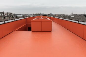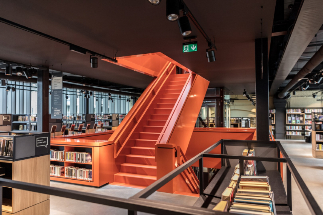 Naast het dak, de gevel en goten zijn ook het dakterras en de trap in de bibliotheek aangepakt. In samenwerking met TWA Architecten en Tissink Specialistische Afdichtingen (TSA) is de opvallende oranje prefab trap voorzien van een Triflex antislipstrook. Hierdoor kunnen de bezoekers de trap veilig bewandelen. Op het dakterras boven de bibliotheek is Triflex BIS Aquapanel samen met Triflex BTS-P kwartszand fijn toegepast. Het terras is met dit systeem verhoogd en het vloerveld en alle details zijn waterdicht en naadloos afgedicht. Dit is gedaan door middel van een vloeibare kunsthars. Om een uniforme uitstraling te creëren is het antislip instrooimateriaal voorzien van dezelfde oranje finishkleur.