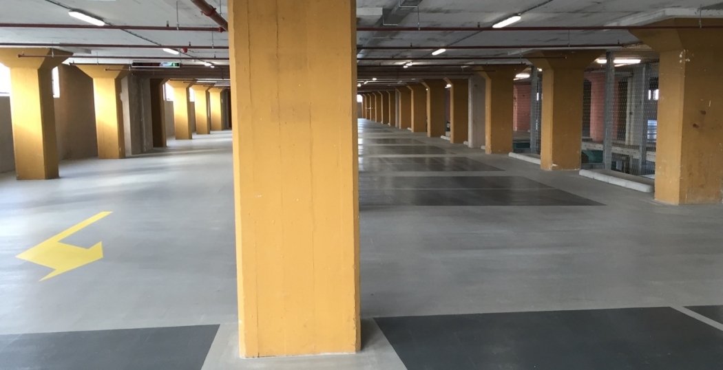 Stam + De Koning verwijderde tussen twee rijen kolommen een deel van de vloeren om hellingbanen aan te leggen. En op de eerste verdieping bracht de aannemer een geïsoleerde druklaag aan. De eerste parkeervloer bevindt zich immers boven de Vershal. De isolatielaag werd voorzien van een naadloze en scheuroverbruggende afdichting met het Triflex CPS-T+ systeem.