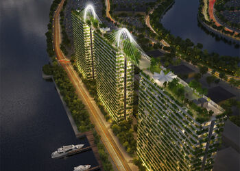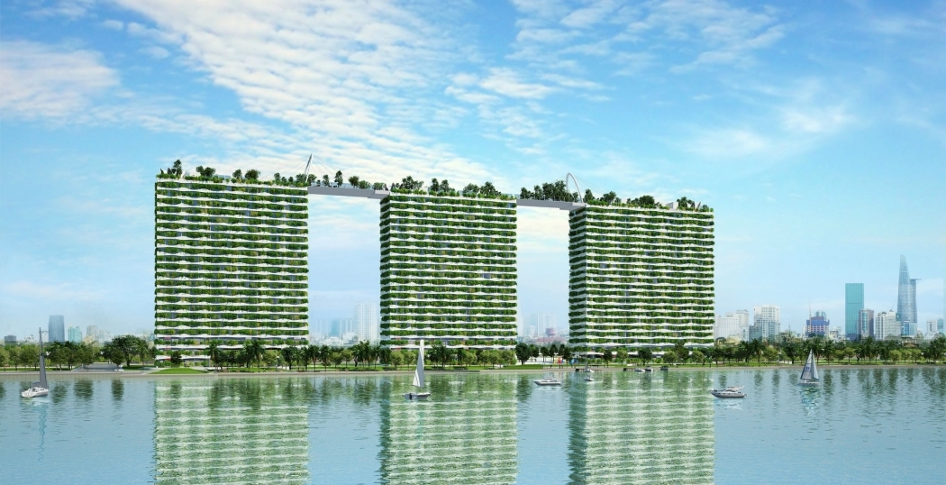 Impressie van de Diamond Lotus torens, met veel verticaal groen en daktuinen verbonden door bruggen. Afbeeldingen door Vo Trong Nghia Architects.