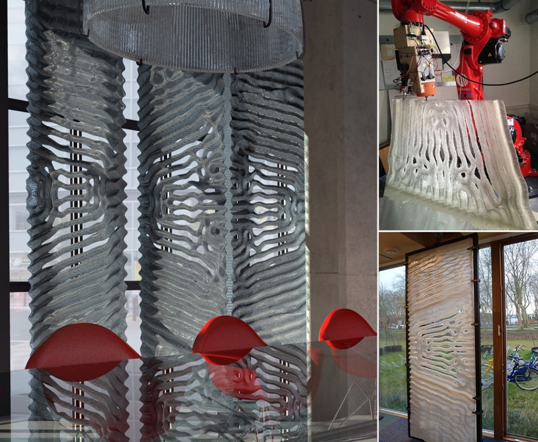 Foto: Een geïntegreerd en 3D geprint gevelconcept met complexe geometrie voor actieve temperatuurcontrole, door Maria Valentini Sarakinioti, Michela Turrin, Martin Tenpierik, Thaleia Konstantinou, Jan Hensen, Marie de Klijn, Roel Loonen, Patrick Teuffel, Arno Pronk, Arthur van Lier, Rens Vorstermans, Eline Dolkemade, Ulrich Knaack, Milou Teeling, Paul de Ruiter, Mark van Erk en Dick Vlasblom KIWI Solutions. Ontwikkeld bij TU Delft en TU/e, gefinancierd door 4TU.Bouw.