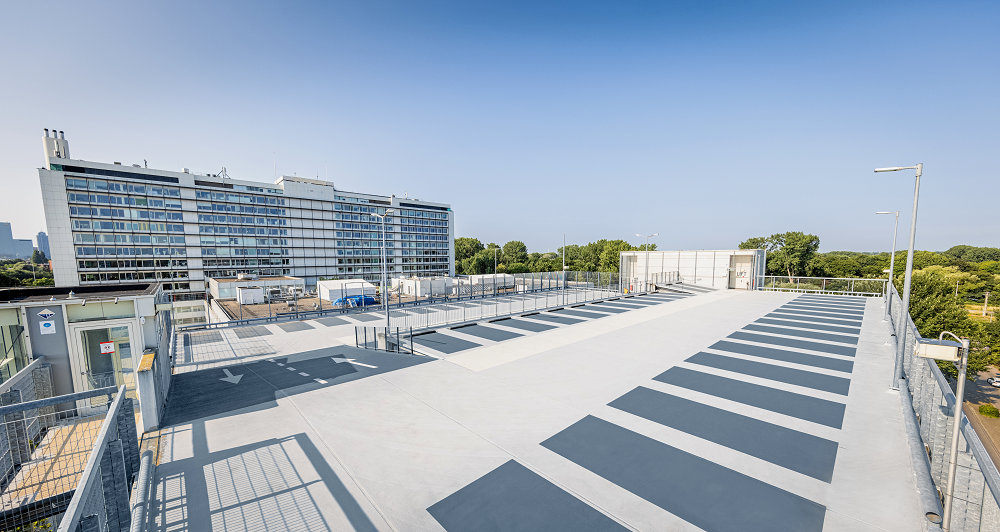 De oude afwerkingen en detailafdichtingen van een wandeldek boven parkeergarage La Défense in Almere waren niet…