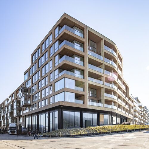 Natuurlijk moeten de materialen van de buitengevel hier bestand zijn tegen het harde weer aan de kust, gekenmerkt door zon, zout, zand en regen. Tegelijkertijd vertellen ze een verhaal over de plek. De zandkleurige bakstenen en de gevelplanken sluiten aan bij het strand, de duinen en de strandpaviljoens. Het zwarte staal in de plint en aluminium van de erkers herinneren aan de industrie van de oude haven. De gevelplanken zijn gerealiseerd van Resysta, een biobased materiaal gemaakt van een restproduct van rijstvlies. Door verschillende kleur- en textuurnuances toe te passen in  het metselwerk, zijn verschillende gebouwdelen binnen het ensemble geaccentueerd.