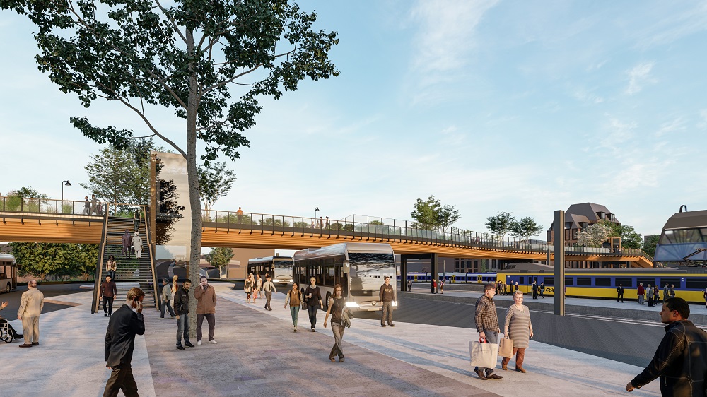 “De nieuwe brug biedt iets unieks. Het wordt écht een opgetilde straat”, legt wethouder Ed Anker enthousiast uit. “De wandelaar kan straks via verschillende paden over deze brug. Heb je haast, dan neem je de snelle route om naar je bus of je werk- of leerplek te lopen. Maar heb je meer tijd of wil je afspreken met iemand, dan zijn er ook fijne plekken waar je lekker kunt zitten of uit kunt kijken over het spoor. We houden uiteraard ook rekening met de (sociale) veiligheid. De brug wordt open en overzichtelijk ingericht en er komt goede verlichting voor de in de avond en nacht. Net als bij een echte straat.”