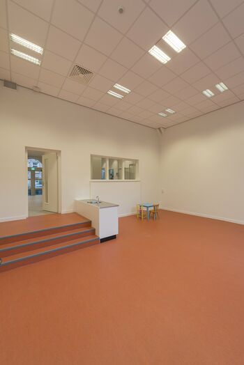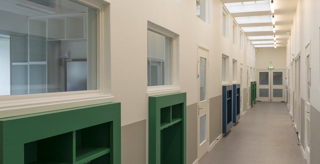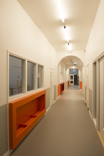 De nieuwe verlichting past goed bij de frisse sfeer en kleuren van de school.