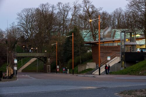 “De schijnwerper Infinitum is toegepast om het plein gedeelte goed te kunnen verlichten en wordt teven gebruikt om het standbeeld bij het Valkhofpark uit te lichten”, vervolgt Versteegt. “Daarnaast wordt dit armatuur ook al aan de Waalkade toegepast, waardoor een herkenbare eenheid ontstaat in het Valkenhofkwartier. Tot slot wordt dit armatuur ook gebruikt door de gemeente en dit heeft voordelen voor het onderhoud. De installatie is tevens voorzien van een OLC van Sustainder waardoor de installatie dynamisch bediend kan worden en goed kan anticiperen op mogelijke toekomstige aanpassingen. Tot slot is gekozen om masten van VDL met houtlook te gebruiken, omdat deze ook al bij de Waalkade toegepast zijn. Het is de bedoeling dat het Valkenhofkwartier en de Waalkade als één samenhangend gebied ervaren gaat worden. De toepassing van soortgelijke masten zorgt voor een uniforme uitstraling.”